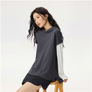 Fake 2-piece 100% cotton contrasting hoodie