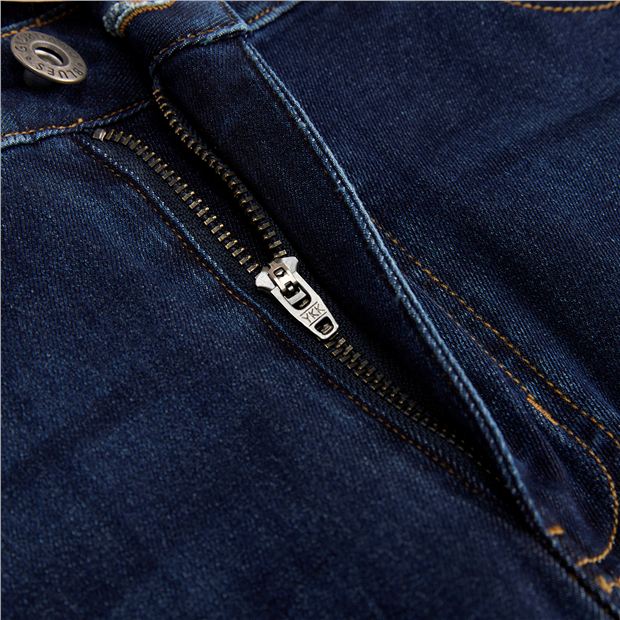 - Button closure, zip fly.